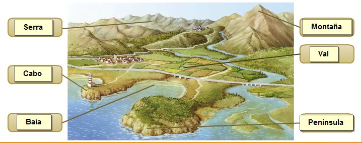 O relevo é o conxunto de formas que ten a superficie da terra. Poden ser de interior (montañas, serras, chairas, depresións…) ou de costa (cabo, baía, península, istmo, golfo…).